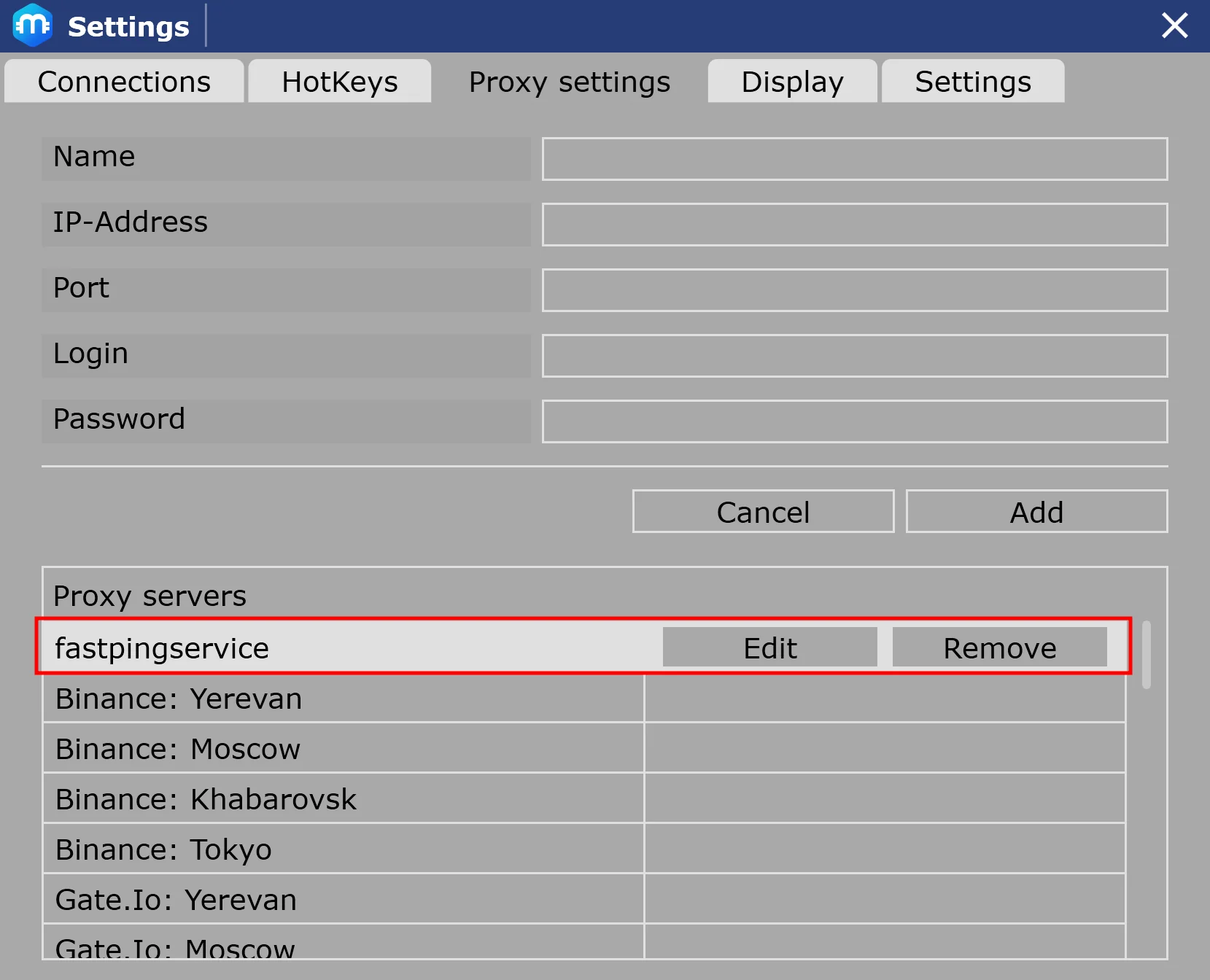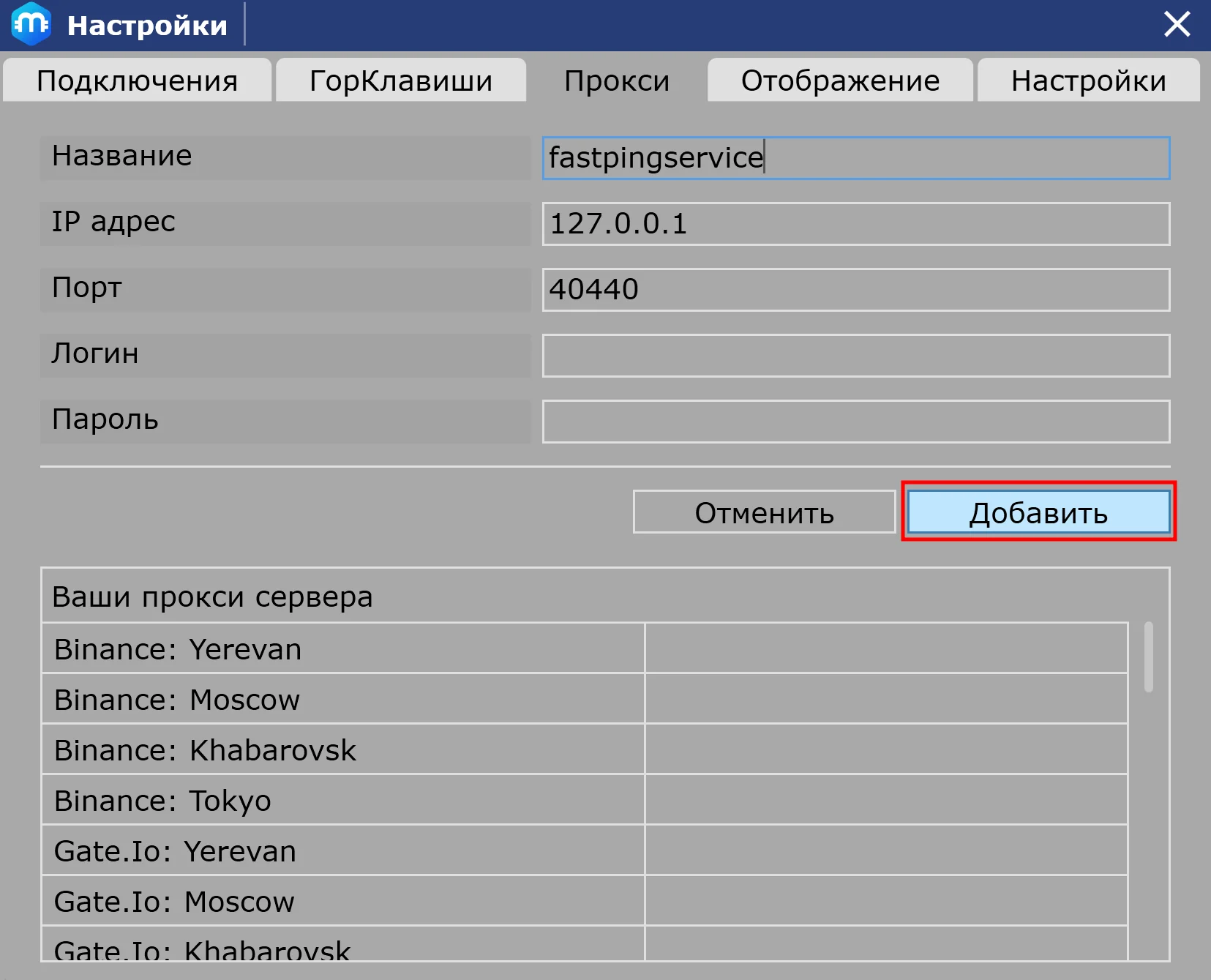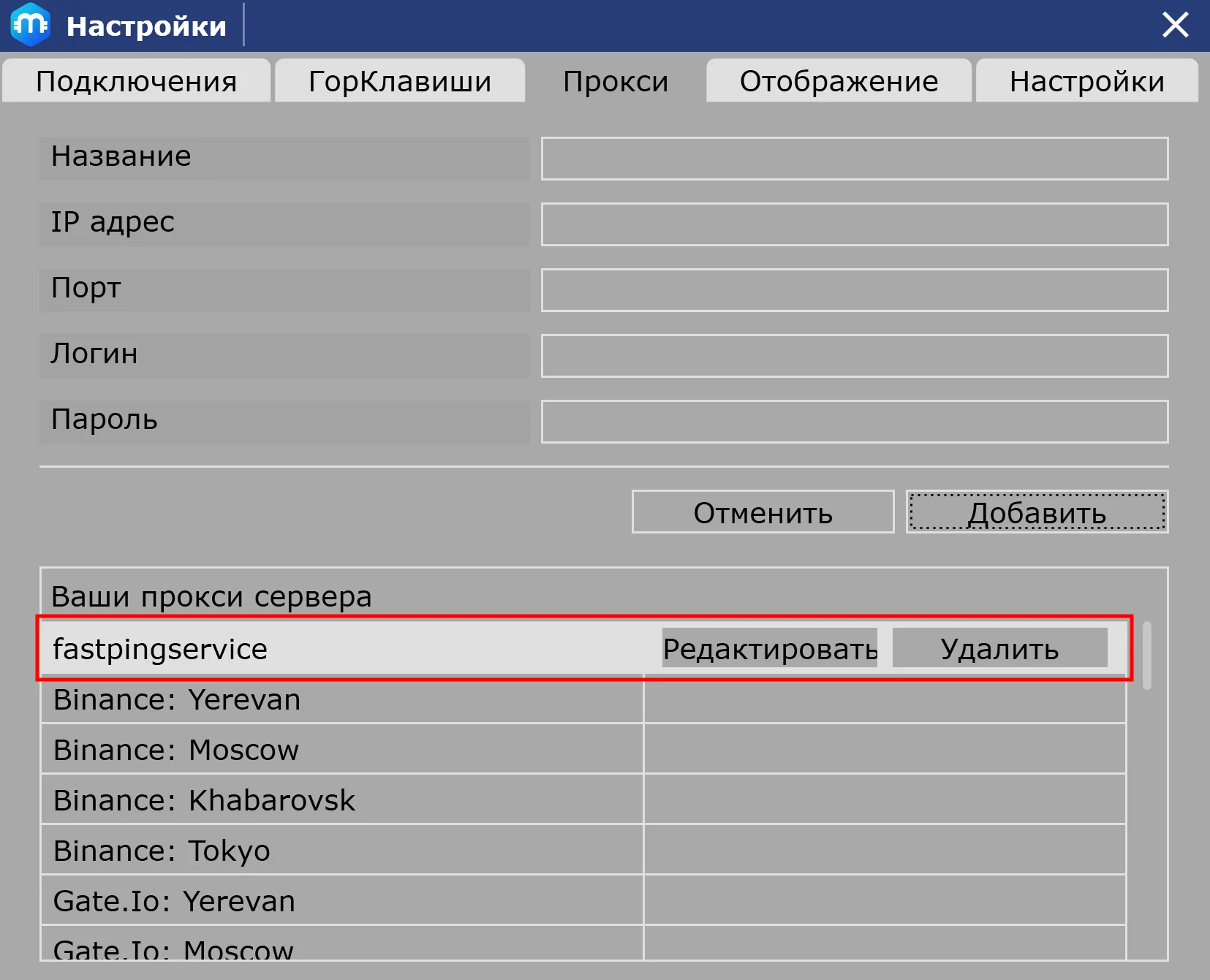 В левом верхнем углу окна терминала нажмите Настройки. В появившемся окне выберите вкладку Прокси. Затем в поле Название укажите название прокси. Рекомендуем изменить название на fastpingservice или любое другое понятное для вас название.