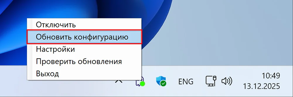 Если подключение сейчас активно — обновите конфигурацию, выбрав в контекстном меню пункт Обновить конфигурацию: